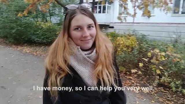 Девушке не хватает осенней романтики и она отправляется на улицу, чтобы прогуляться. Н ее пути встречается парень и красотка с ним увлеченно болтает, давая согласие на секс за деньги. Чувак уводит в уединение рыжую сучку и дает ей в ротик, когда она становится на корточки. Затем милашка прямо в подъезде дает себя трахать и становится перед пацаном раком. Он чпокает в пизду милашку и далее дает попробовать свою сперму.